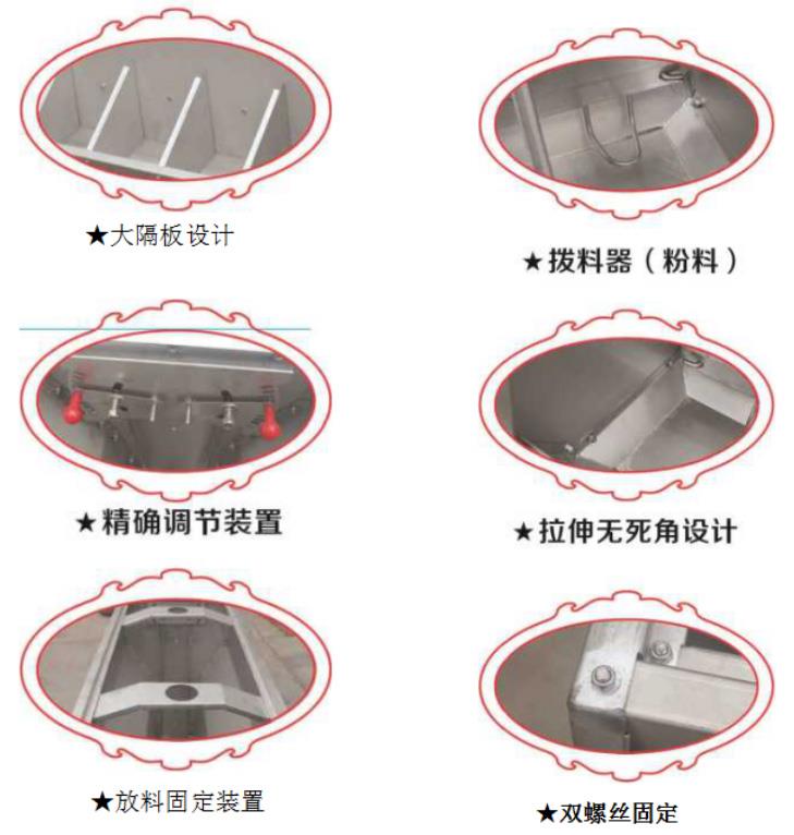 2、安裝簡單、易操作、出料均勻,料槽裏麵表麵光滑,不易存料,清潔方便。